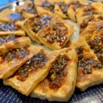 - Drain tofu, wipe dry with paper towel, cut into 1cm thick pieces